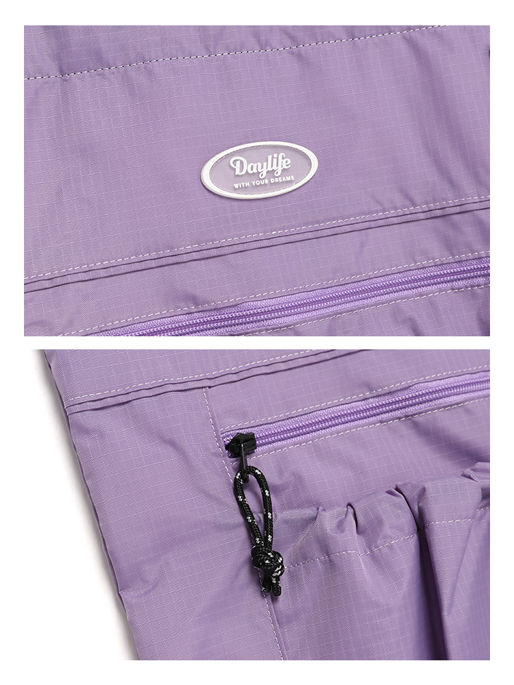 肩紐部分をストリングではなくバックパックに使用されるウェビングを使用し着用時は肩に安らぎを与え、上部にカバンの取っ手を適用しました。 また、前面部にはファスナーポケットとストリングポケットを適用し一般的なジムサックではなくポケット活用度の高いスタイルで製作されています。