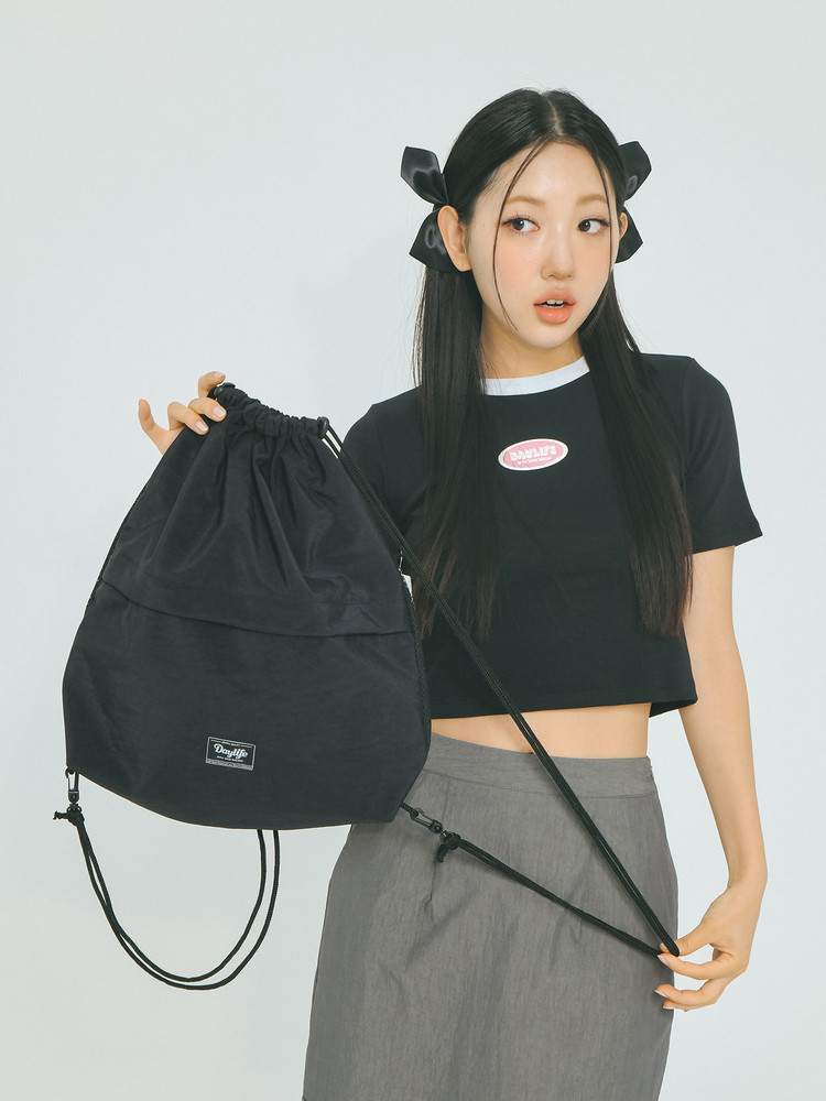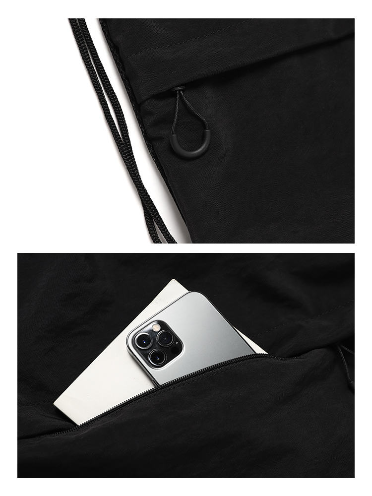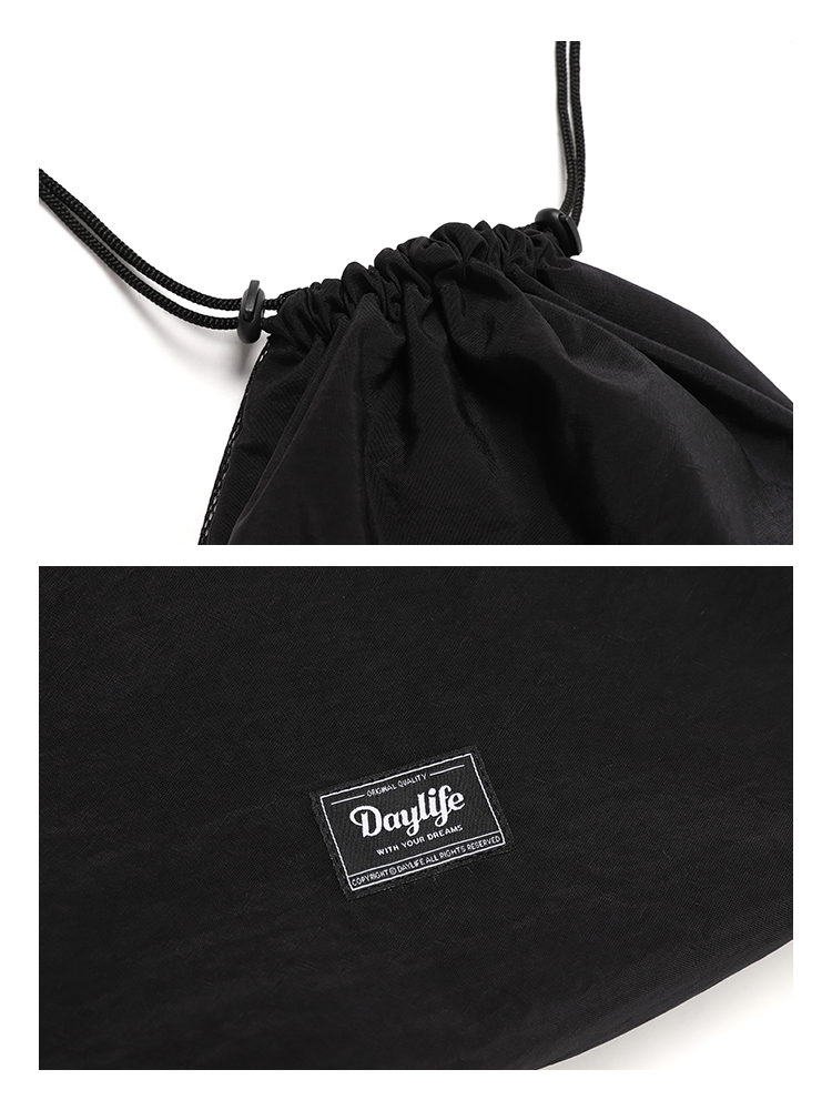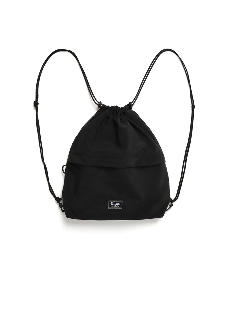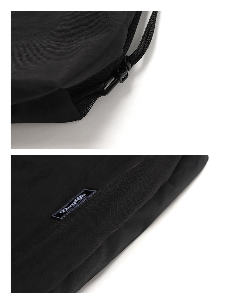 前面部のメインスペースとハーフファスナーポケットで構成されており、背面部はメッシュポケットを使用して別の空間で構成されています。 表と裏の空間が分離され両面着用が可能な2-faceスタイルの製品で、計3つの空間に分けられ収納活用度が非常に高いスタイルのジムサックです。